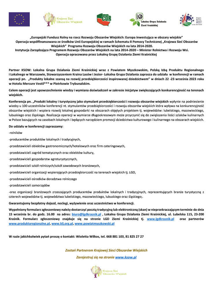 Partner KSOW: Lokalna Grupa Działania Ziemi Kraśnickiej wraz z Powiatem Myszkowskim, Polską Izbą Produktu Regionalnego i Lokalnego w Warszawie, Stowarzyszeniem Kraina Lasów i Jezior- Lokalna Grupa Działania zaprasza do udziału w konferencji w ramach operacji pn. „Produkty lokalne szansą na rozwój przedsiębiorczości inspirowanej dziedzictwem” w dniach 22 -23 września 2023 roku
