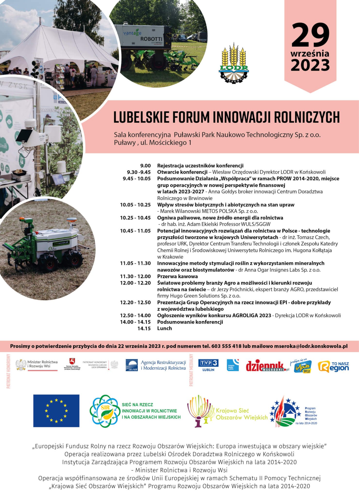 Lubelski Ośrodek Doradztwa Rolniczego serdecznie zaprasza na konferencję „Lubelskie Forum Innowacji Rolniczych”, która obędzie się  29 września 2023  roku w Puławskim Parku Naukowo Technologicznym Sp. z o.o. Puławy , ul. Mościckiego 1.